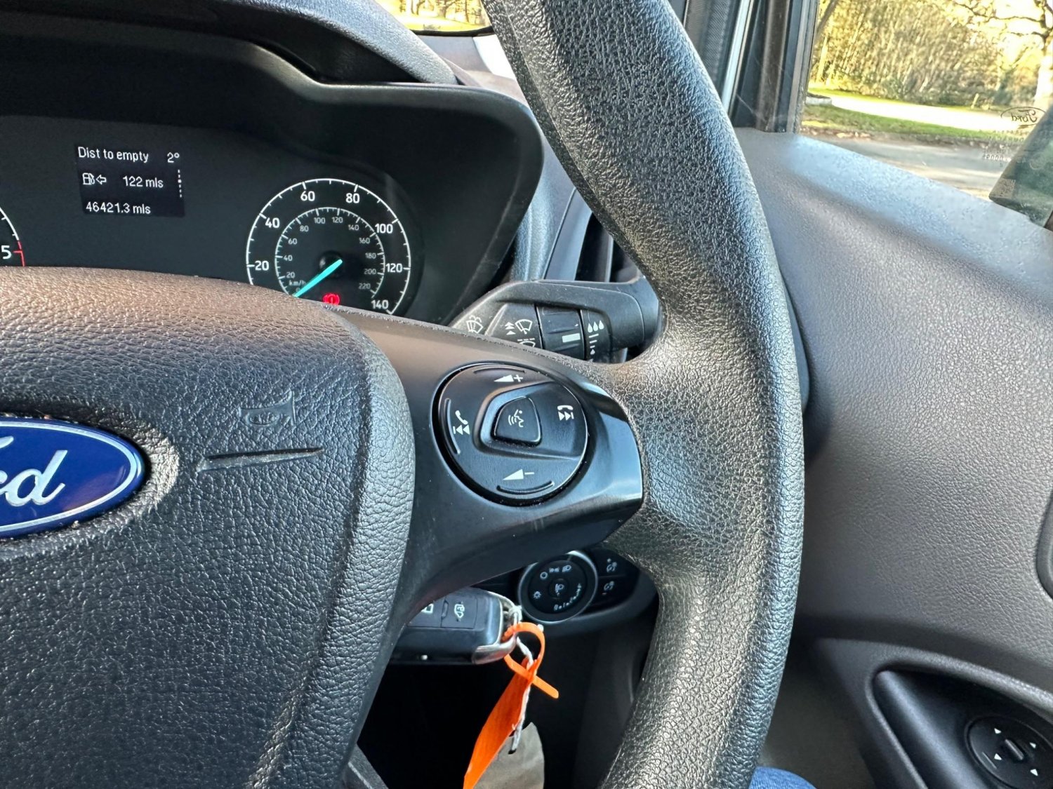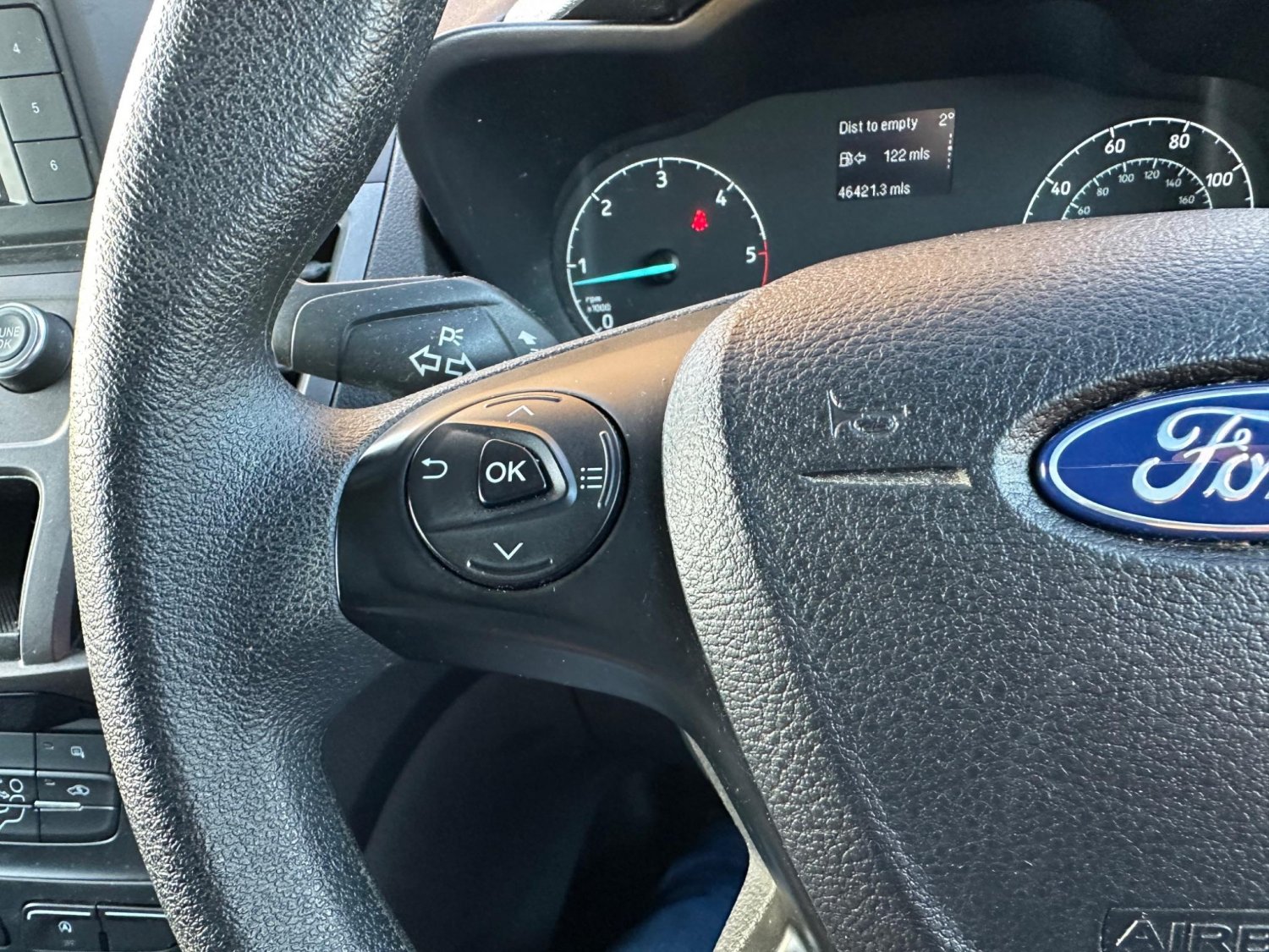 12v and AUX Power Point in Instrument Panel, 16in Steel Wheels with Full Wheel Covers, 1x Remote Key and 1x Plain Key, 2-Speed Variable Intermittent Front Wipers, 8-Way Driver Seat with Fore-Aft - Recline - Height and Lumbar Adjustment, ABS-EBD-ESC, Active Shutter Grille, Airbags - Driver, Audio System with 4.2in Screen, Bulkhead - Full Steel, Configurable Locking 1, Courtesy Lights - Front Dome Light with 2 Map Lights, DIN Cargo Tie Downs, Daytime Running Lamps, Door Handles - Interior - Black, Door Handles - Self Colour, Door Mirrors - Self Colour Housing, Door and Liftgate Handles - Self Colour, Driver Seat Belt Minder, Driver and Passenger Sunvisors, Dual Cup Holder, EPAS - Electric Power Assisted Steering, Easy Clean Load Floor, EcoSelect Function, Emergency Brake Warning, Engine Immobiliser, Ford Easy-Fuel Capless Refuelling System, Front Bumper - Body Colour, Front Fog Lights, Front Grille - 3 Bar - Self Colour, Front Lip Spoiler, Front and Rear Towing Hooks, Gearshift Knob - Polyurethane, Glove Box with Lid, Halogen Headlights - Side Lights - Rear Fog Lights - Reversing Lights, Heavy Duty Battery - 80Ah, High Mounted Brake Light, Hill Start Assist, Interior Grab Handles - Front, Load Box Light, Locks - Auto Relocking - Doors Relock after 45 Seconds if no Door is Opened, Overhead Storage Shelf, Plastic Cargo Floor Liner, Power Door Deadlocks - Double Locking, Power Door Mirrors - Heated, Power Windows - Driver - One Touch Down, Quickclear Heated Windscreen, Rake and Reach Steering Adjustable, Rear Bumper End Caps - Body Colour, Rear Cargo Door - Unglazed, Rear Fog Lamps, Remote Central-Double Locking, Roof Mounted Microphone, Seat Belts - Front - 3 Point with Seat Pre-Tensioner - Height Adjust and Load Limiters, Seat Pack 4, Security - Passive Anti-Theft System - PATS, Single Passenger Seat Centre Console, Single Side Load Door - Kerbside, Spare Wheel - Steel, Standard Duty Alternator, Steering Wheel - 4 Spoke PU with Black Shells, Steering Wheel Radio Controls, Storage Box - Instrument Panel, Trip Computer, Twistbeam, Wide Bodyside Mouldings - Self Colour